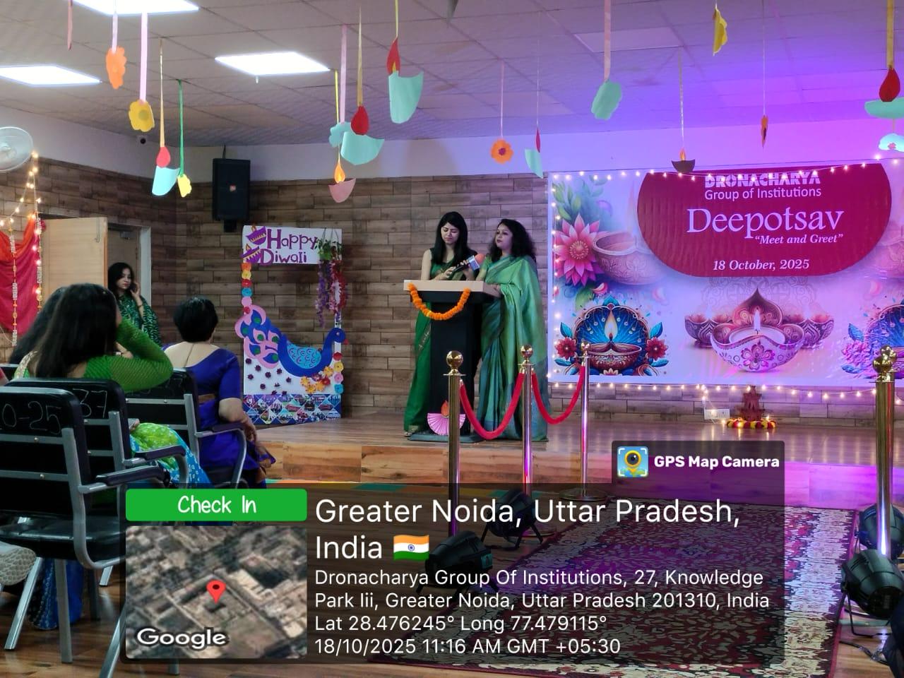 Cultural Club of Dronacharya Group of Institutions (DGI), Greater Noida, celebrated Deepotsav – “Meet & Greet 2025” with immense joy and enthusiasm on 18th October 2025. The event was coordinated under the guidance of Prof. Nandini Tomar and brought together faculty members in a spirit of unity, festivity, and togetherness.