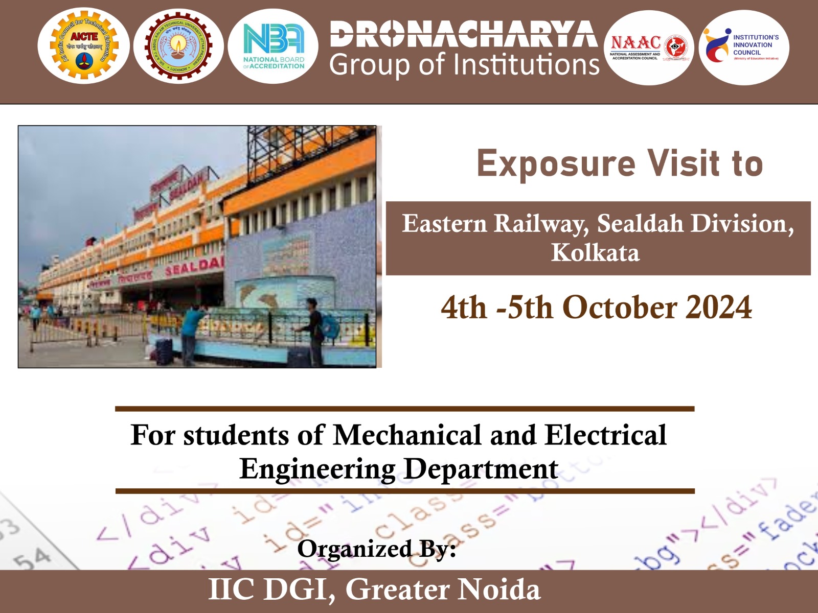 Institution’s Innovation Council (IIC) of Dronacharya Group of Institutions, Greater Noida, organized a two-day industrial exposure visit to the Eastern Railway, Sealdah Division, Kolkata for Mechanical and Electrical Engineering Departments on 4th–5th October 2025.