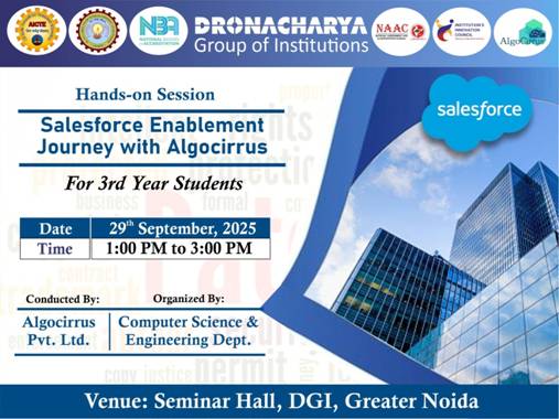Department of Computer Science and Engineering at Dronacharya Group of Institutions, Greater Noida, conducted an insightful Hands-On Session on “Salesforce Enablement Journey” in collaboration with AlgoCirrus Pvt. Ltd. on 29th September 2025. The session was organized for third-year students to enhance their industry readiness by bridging the gap between classroom learning and real-world technological applications. Focused on Salesforce, one of the worlds’s leading Customer Relationship Management (CRM) platforms, the session aimed to equip students with practical exposure to cloud-based business solutions that are transforming modern enterprises.