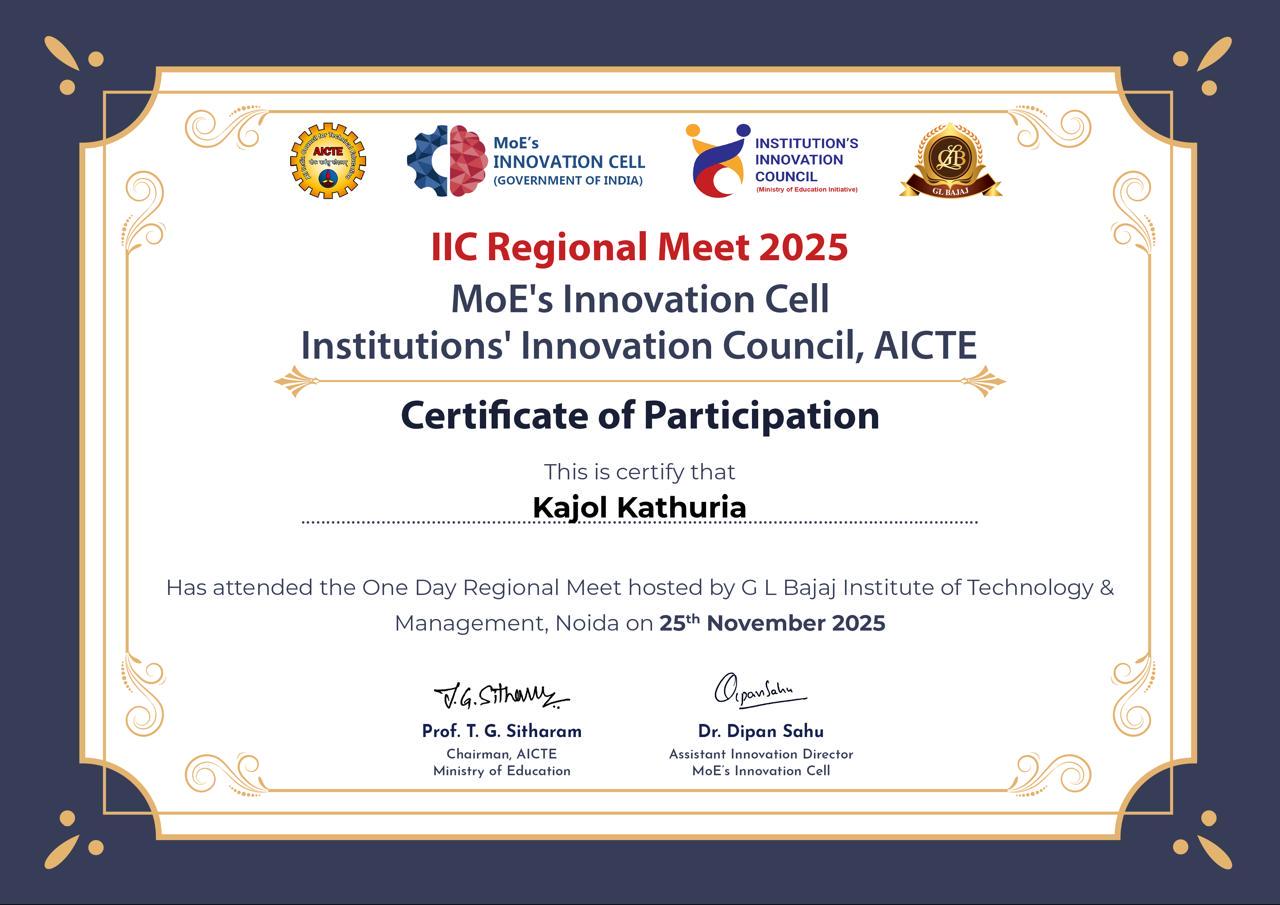 Institution’s Innovation Council (IIC), under the Ministry of Education’s Innovation Cell (MIC), organized a Regional Meet on 25th November 2025 at GL Bajaj Institute of Technology & Management (GLBITM). The meet aimed to foster innovation, entrepreneurial thinking, and startup culture across higher educational institutions by bringing together innovators, mentors, startups, and ecosystem enablers on a unified platform.