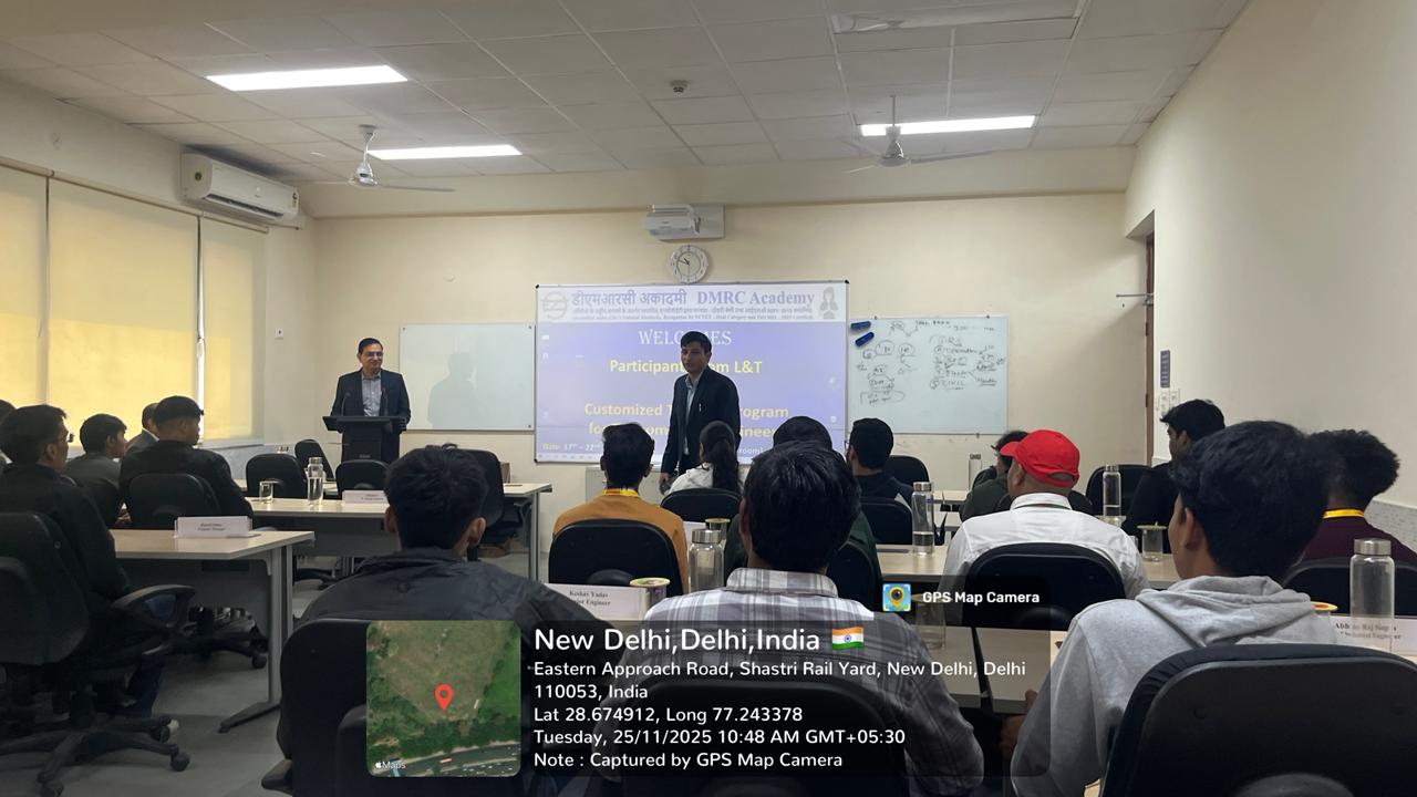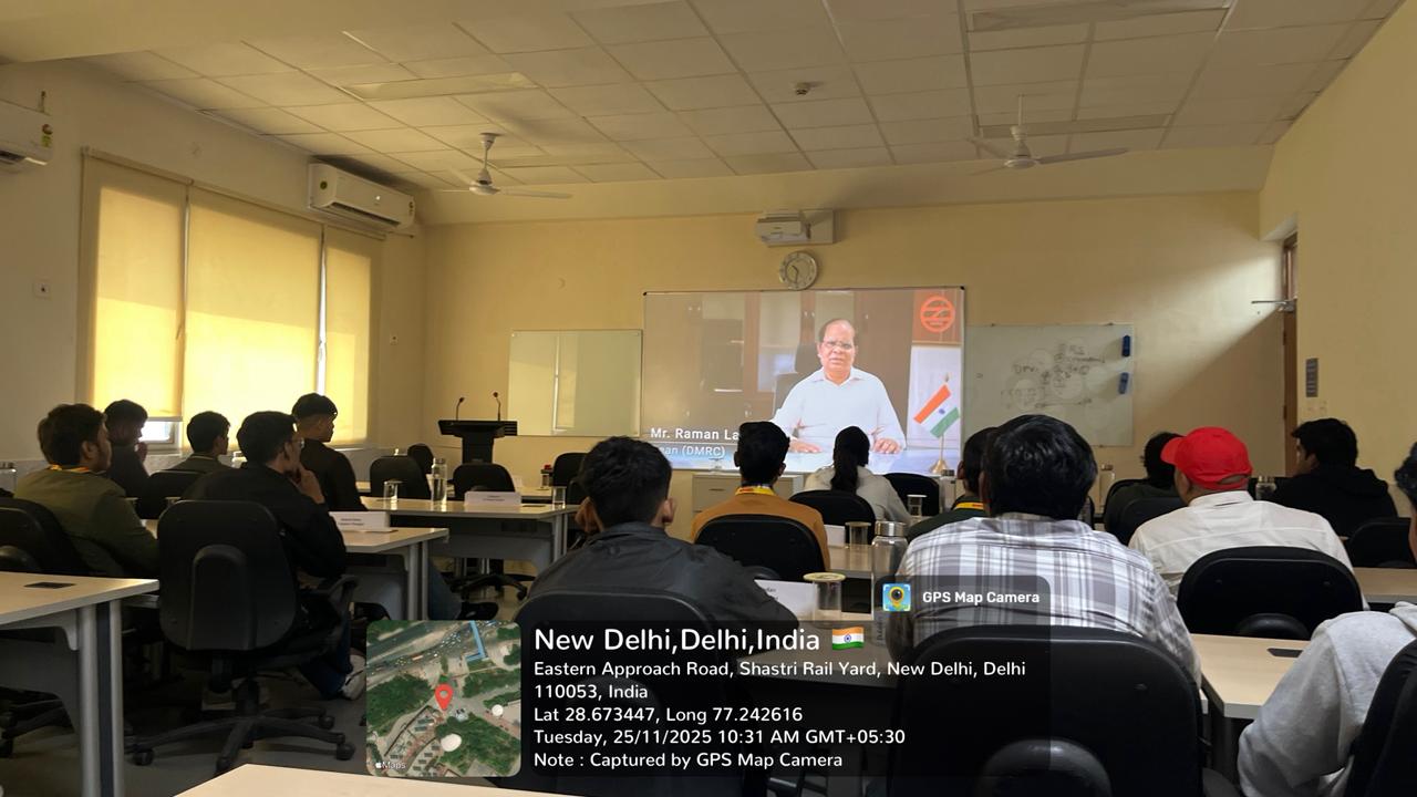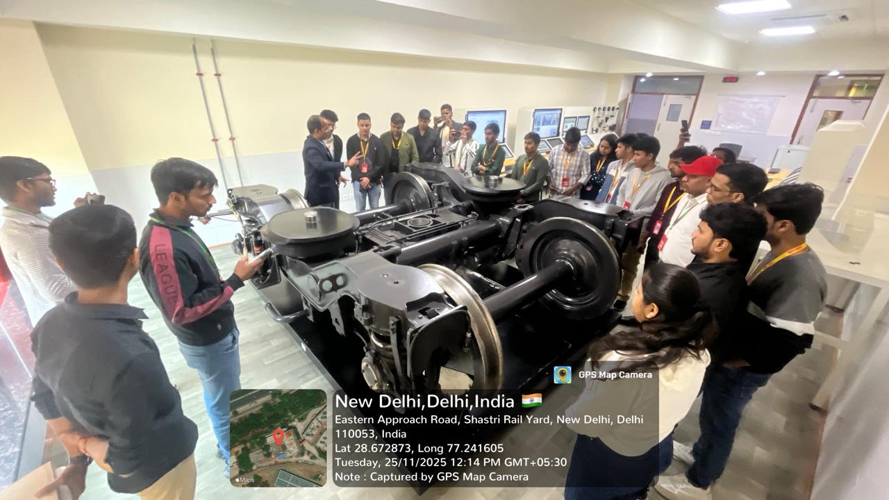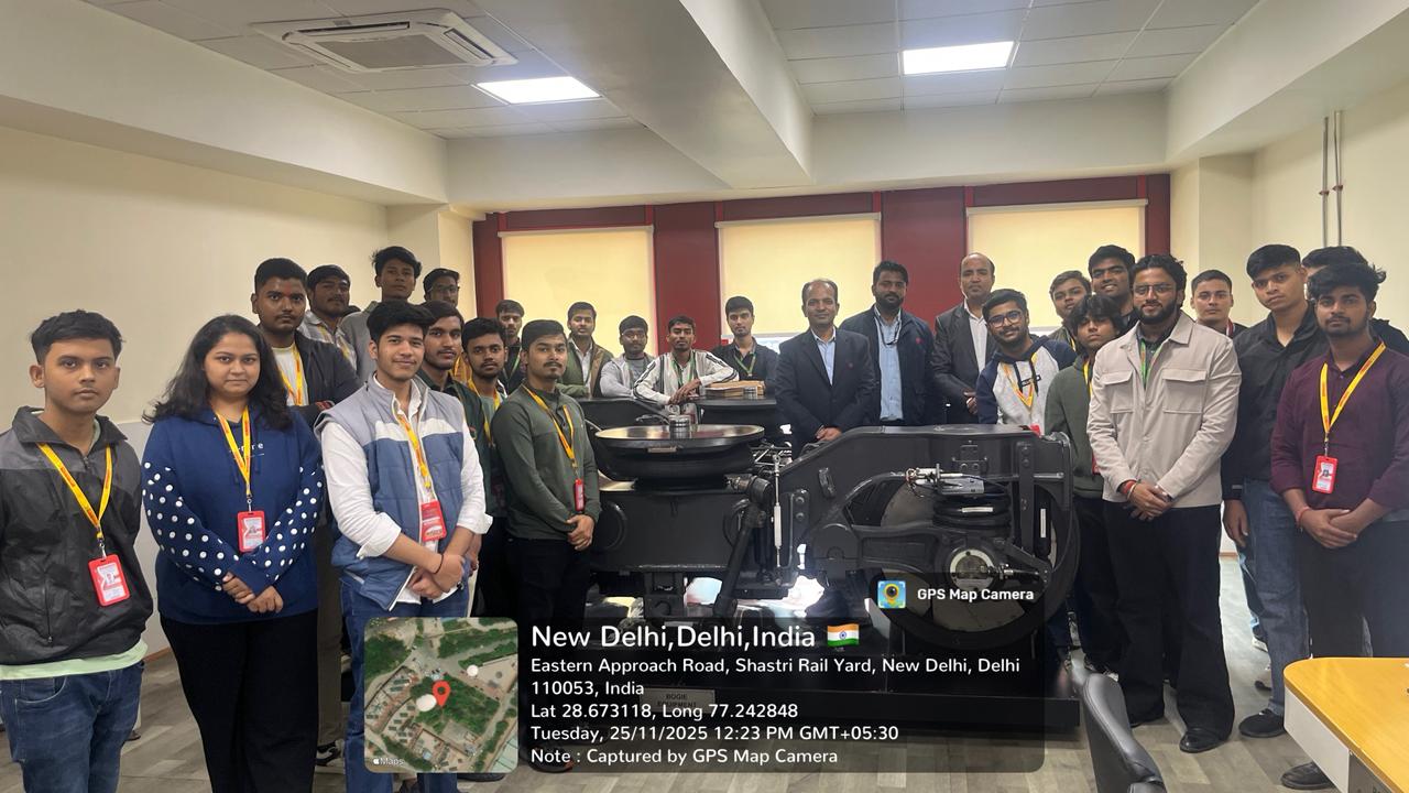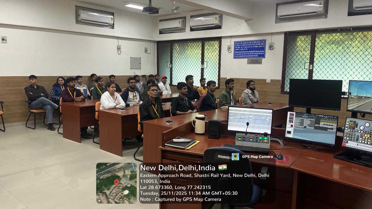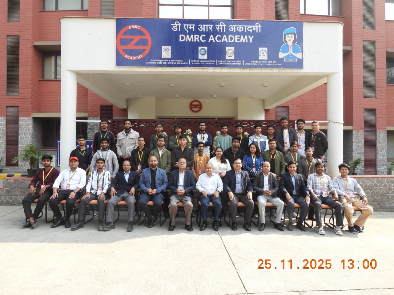 The students were warmly welcomed by Prof. Mukesh Kumar (Rolling Stock, DMRC Ltd.) and other officials who introduced the functioning, technological evolution, and safety-driven approach of DMRC. During the visit, students explored the Signalling & Control Systems Lab, experienced ATC/ATO/ATP/CBTC technologies, observed advanced train operation simulators, and visited the Rolling Stock Maintenance Section.