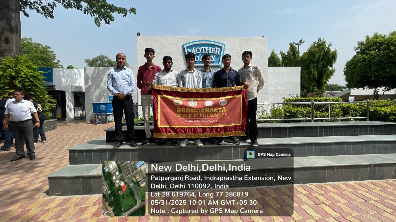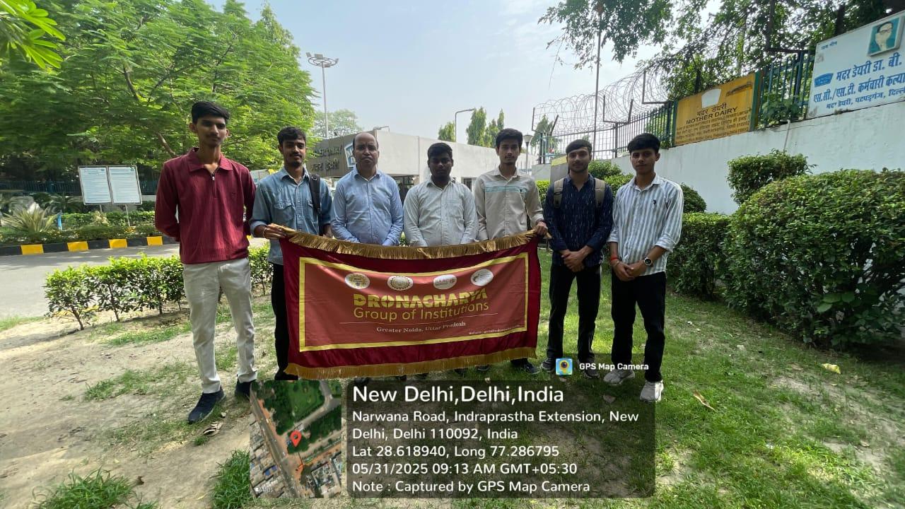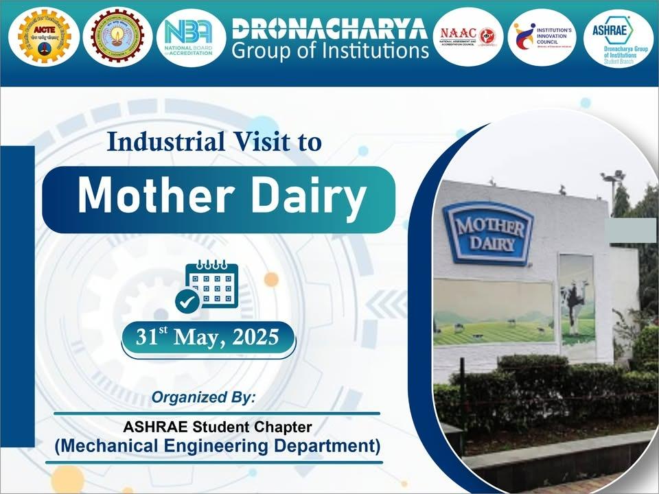 ASHRAE Student Chapter, Dronacharya Group of Institutions, Greater Noida, organized an industrial visit for the students of Mechanical Engineering Department to Mother Dairy – Cold Storage, located at Patparganj, Delhi, on 31st May 2025. The visit was conducted under the supervision of Mr. Ankur Sachdeva (Assistant Professor, ME) as part of ASHRAE’s initiative to strengthen students’ practical understanding and provide real-world exposure to industrial refrigeration and air conditioning systems.