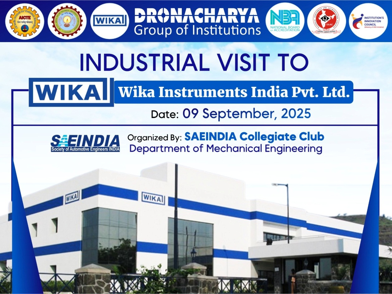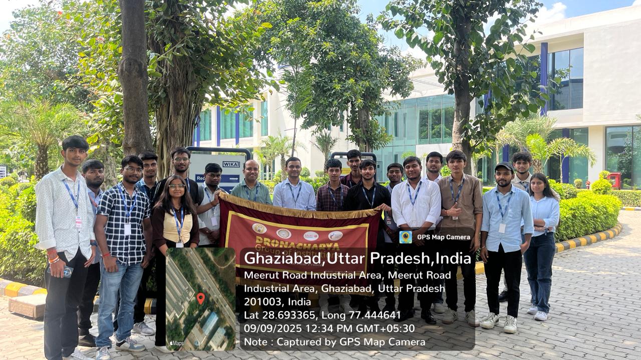 SAE India Collegiate Club, Dronacharya Group of Institutions, Greater Noida, organized an industrial visit for 2nd and 3rd year Mechanical Engineering students to WIKA Instruments India Pvt. Ltd., situated in the Meerut Road Industrial Area, Ghaziabad (U.P.), on 9th September 2025. 20 students took part in the visit, accompanied by Dr. Shailesh Kumar Singh (HOD, ME), Mr. Ankur Sachdeva (Assistant Professor, ME), and Mr. Vishnu Kuntal (Assistant Professor, ME).
