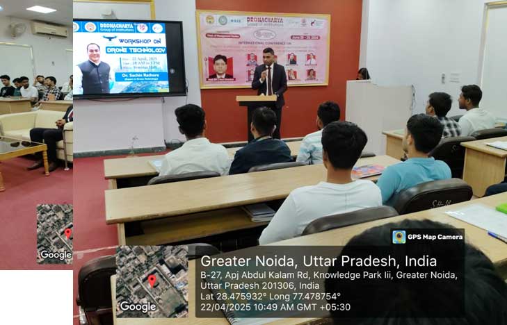 ISTE Student Chapter, Dronacharya Group of Institutions, Greater Noida, organized a one-day workshop on “Drone Technology” for1st, 2nd,and 3rdyear students ofMechanical Engineering at the college campus on 22nd April 2025. Dr. Sachin Rathore(professional in the field of drone technology) along with his dedicated team of five enthusiastic student researchers visited the campus for the workshop. The program was coordinated by the faculty members, Mr. Ankur Sachdeva, Assistant Professor, Dr. Saket Kumar, Assistant Professor, Mr. Vishnu Kuntal and Dr. Deepak Kumar.