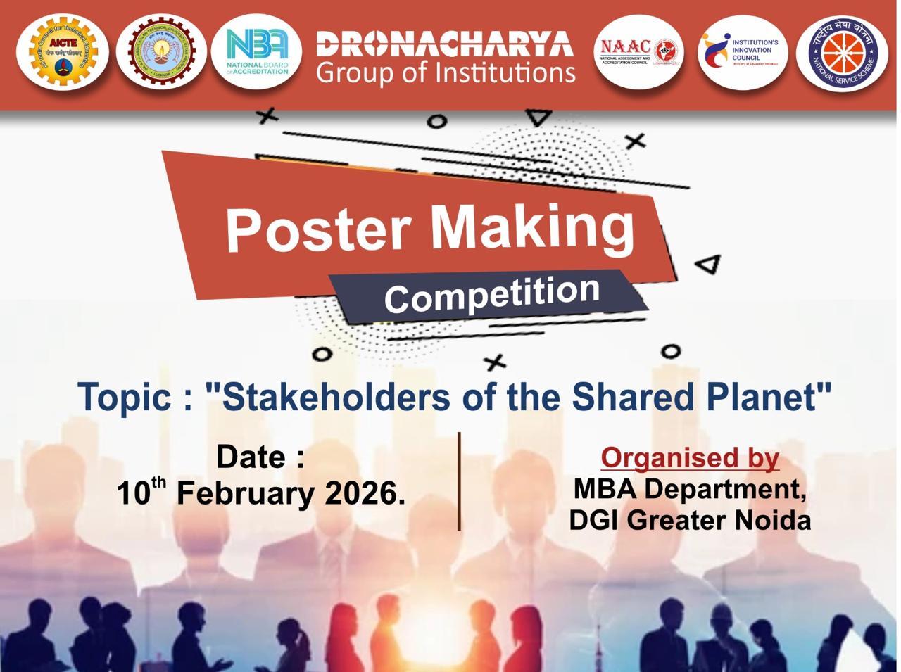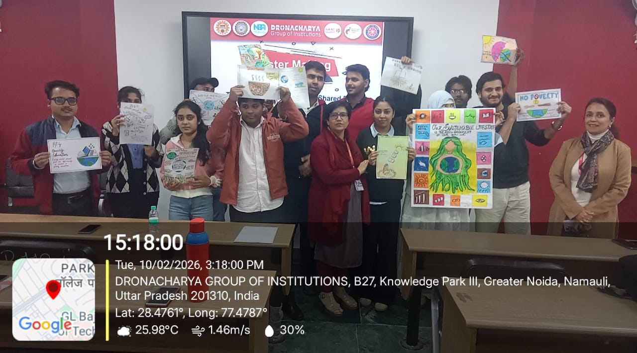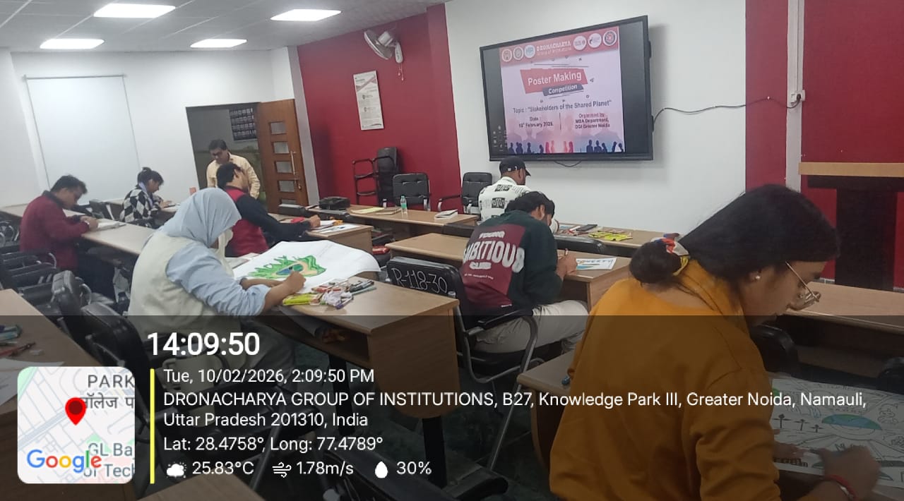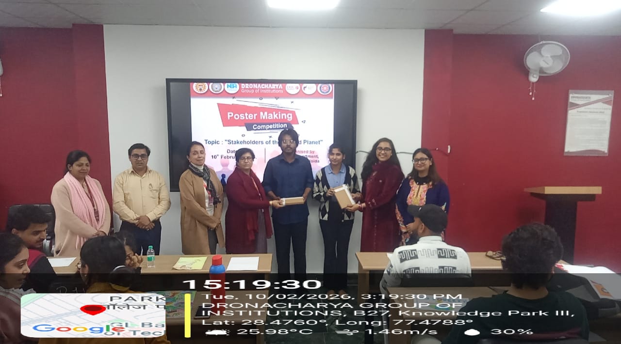 Dronacharya Group of Institutions, Greater Noida, successfully organized a Poster Presentation Competition on the theme “Stakeholders of the Shared Planet - SDG Goals” on 10th February 2026. The event coordinated by Ms. Kawalpreet Sawhney (Assistant Professor)aimed to create awareness among students about the collective responsibility of individuals, institutions, industries, governments, and communities in achieving the United Nations Sustainable Development Goals (SDGs). Students from the MBA department enthusiastically participated, presenting creative and informative posters that addressed global challenges such as climate action, quality education, gender equality, responsible consumption, and sustainable cities.