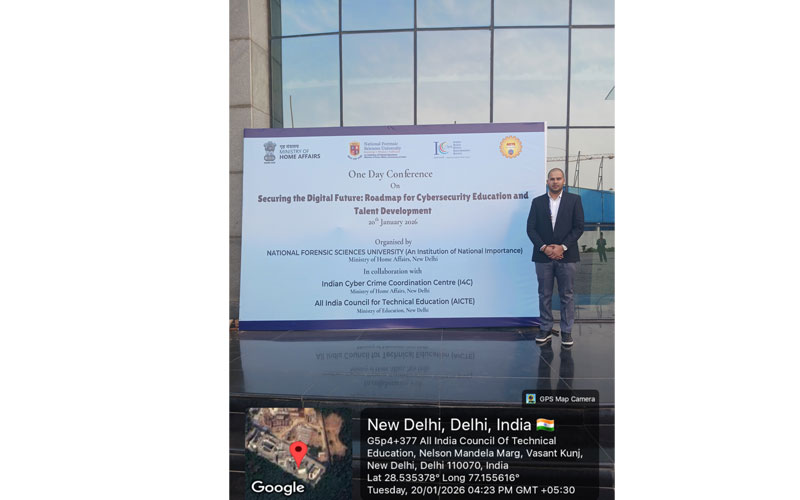 Mr. Shekhar Tyagi (Assistant Professor, CSIT) and Mr. Himanshu (Assistant Professor, CSE) of Dronacharya Group of Institutions’, attended the One-Day National Conference titled “Securing the Digital Future: Roadmap for Cybersecurity Education and Talent Development”, held on 20th January 2026 at the AICTE Headquarters, Vasant Kunj, New Delhi. The conference was organized by the National Forensic Sciences University (NFSU) in collaboration with the Indian Cyber Crime Coordination Centre (I4C) and the All-India Council for Technical Education (AICTE).