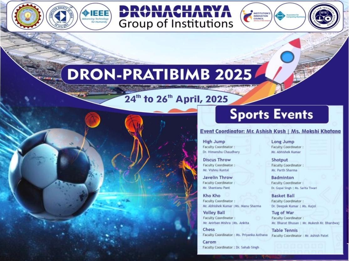 Sports Club, Dronacharya Group of Institutions successfully organized a vibrant series of Sports Events as part of its annual fest Dron-Pratibimb 2025, held from 24th to 26th April, 2025. The sports activities were designed to encourage active participation, promote fitness awareness, and cultivate teamwork among students.