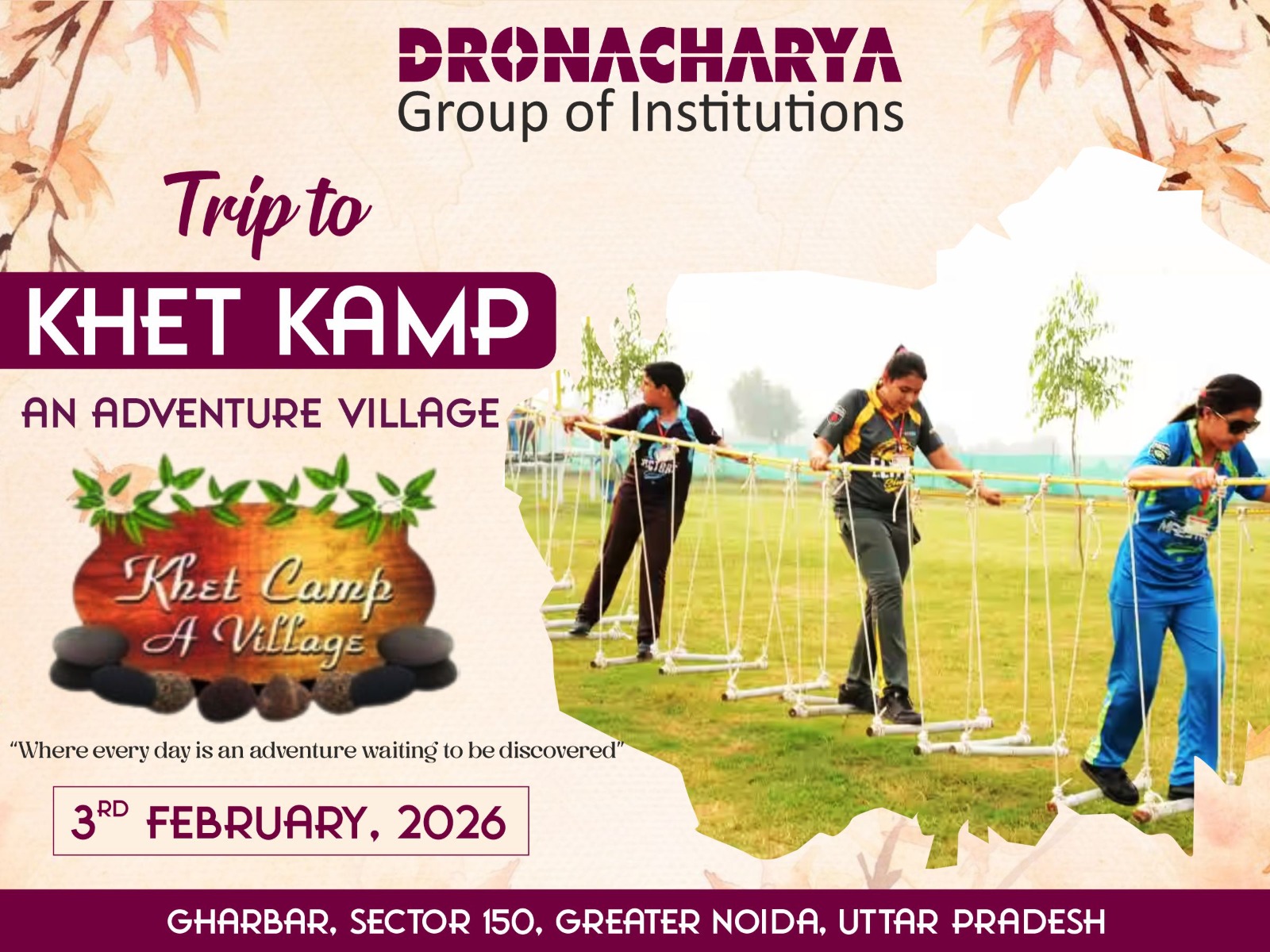 Tourist Club of Dronacharya Group of Institutions organised an adventurous and recreational trip for its faculty and staff to Khetkamp, an adventure village, on 3rd February 2026, coordinated by Mukesh Kumar Bhardwaj (Asst Prof.) and Anu Jain (Asst. Prof.). The trip was planned with the objective of promoting team bonding, relaxation, and rejuvenation among employees while offering exposure to adventure-based activities in a natural setting.