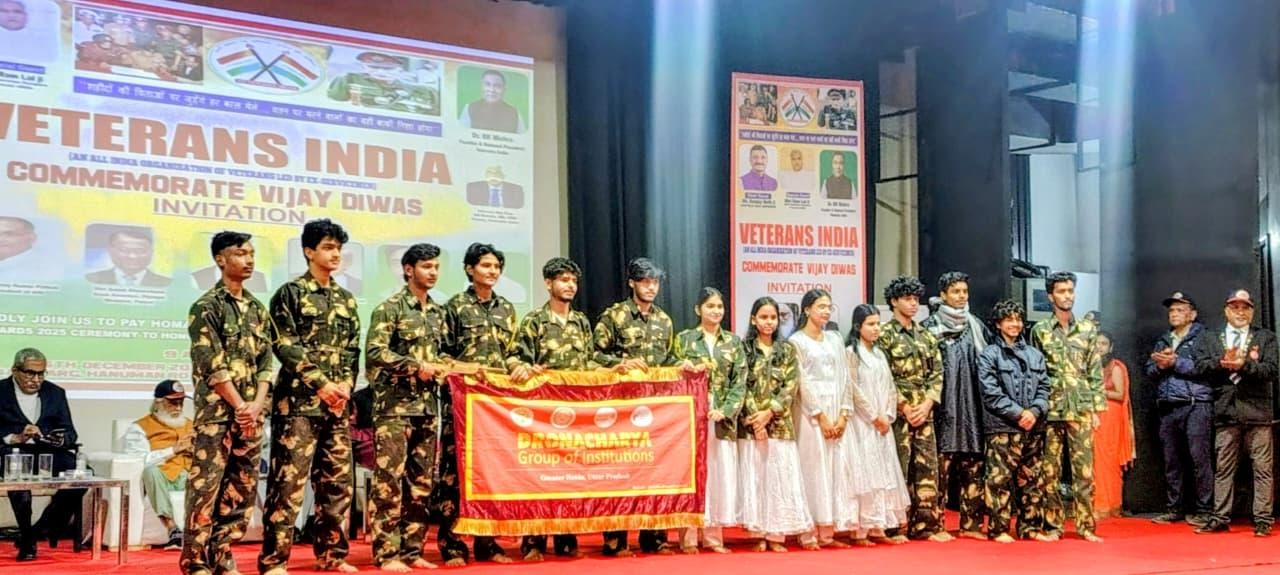 Dronacharya Group of Institutions, Greater Noida, was cordially invited to represent the institution at this grand ceremony. The programme commenced with warm greetings and interactions with veterans, creating a solemn, respectful, and patriotic atmosphere. The presence of decorated veterans, academicians, institutional leaders, and distinguished dignitaries made the event deeply inspiring and meaningful for all attendees.