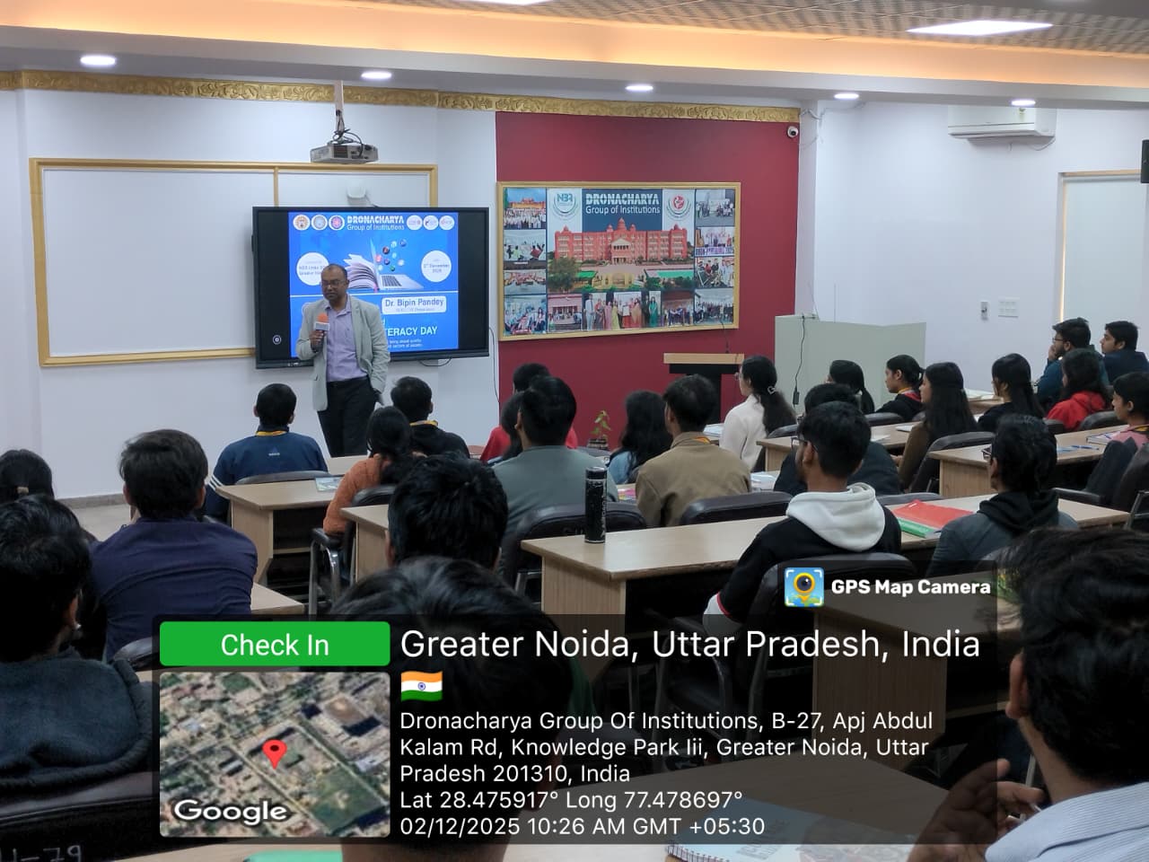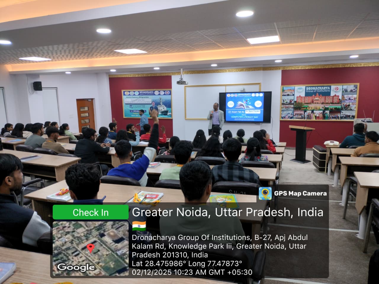 NSS Units of Dronacharya Group of Institutions, Greater Noida, organized World Computer Literacy Day on 2nd December 2025 with the objective of promoting digital awareness and highlighting the growing importance of computer education in today’s technology-driven world. The initiative aimed to sensitize students - especially budding engineers -about the essential role that computer literacy plays in academics, professional success, and responsible digital citizenship.