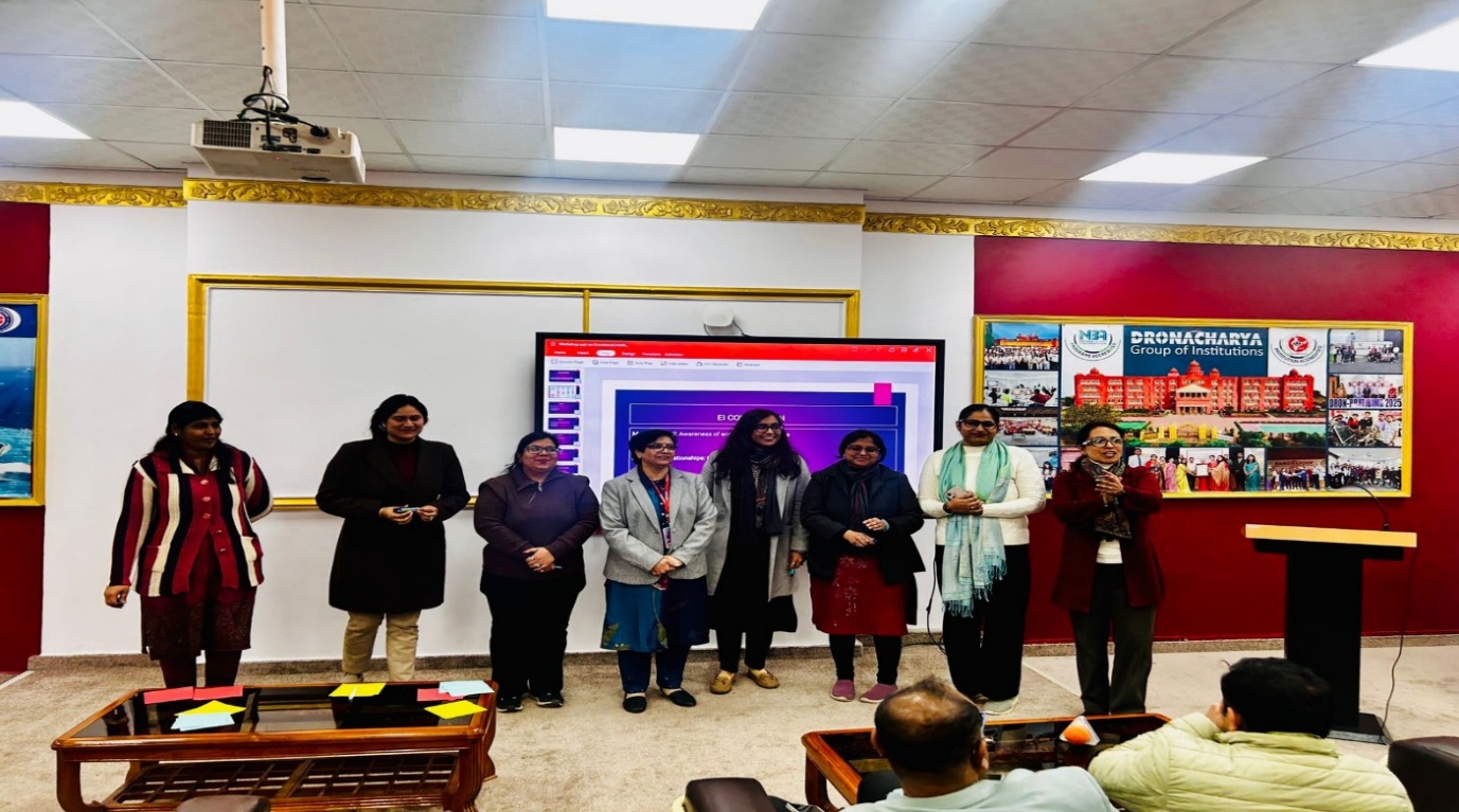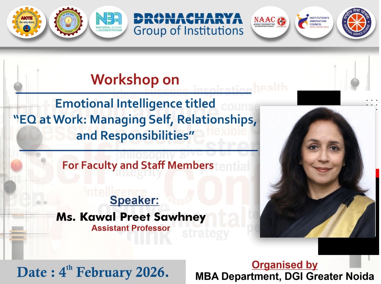 MBA Department of Dronacharya Group of Institutions organised a Workshopon Emotional Intelligence titled “EQ at Work: Managing Self, Relationships, and Responsibilities” on 4th February 2026. The session was conducted by Ms. Kawalpreet Sawhney, Assistant Professor, with the objective of enhancing faculty members’ understanding of Emotional Intelligence (EQ) and its application in academic and professional settings.