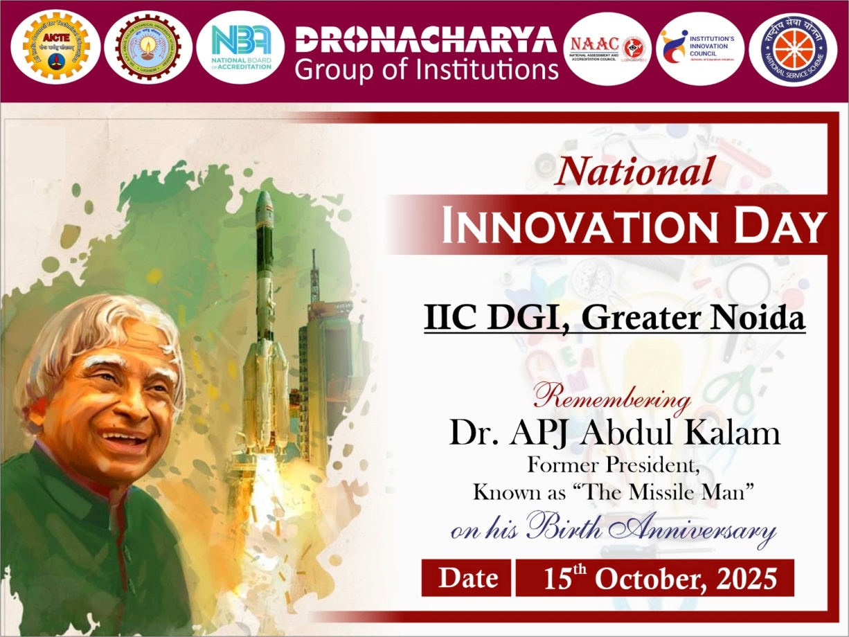 Institution Innovation Council (IIC)andDepartment of Mechanical Engineering of Dronacharya Group of Institutions, Greater Noida organized a Technical Poster Presentation Competition on 15th October 2025 to markNational Innovation Day, held in remembrance of Dr. A.P.J. Abdul Kalam, the “Missile Man of India.” The event, themed“Innovative ideas in the fields of Science, Engineering, and Technology”,provided an excellent platform for students to display their creativity, technical knowledge, and inventive thinking across various scientific and technological domains.