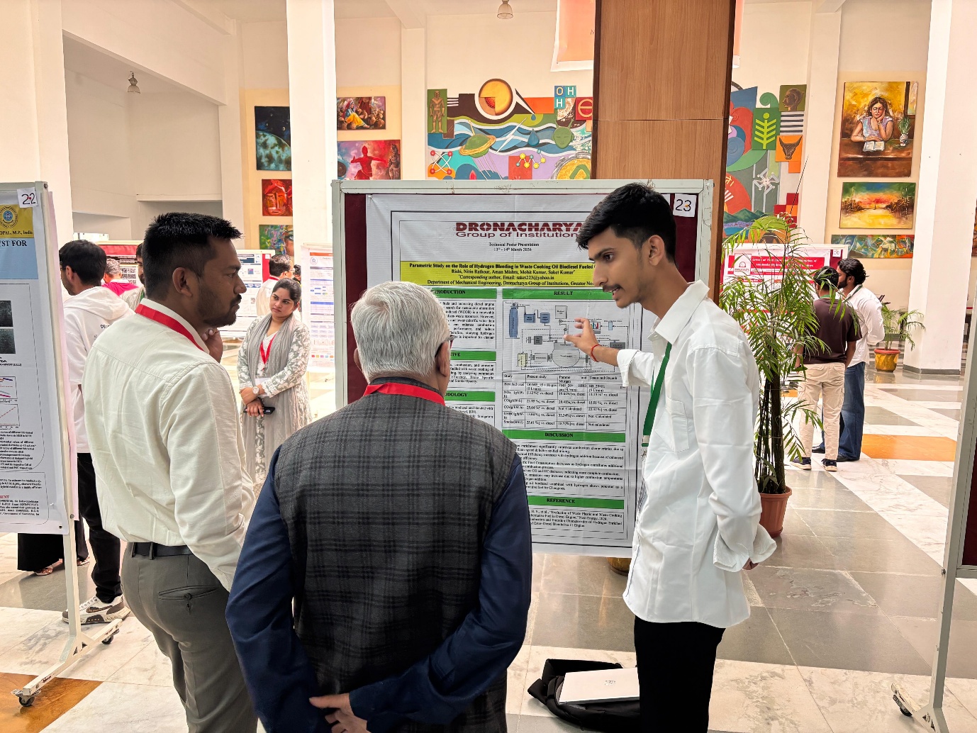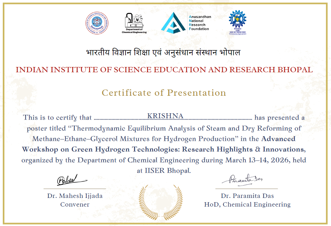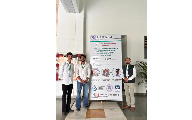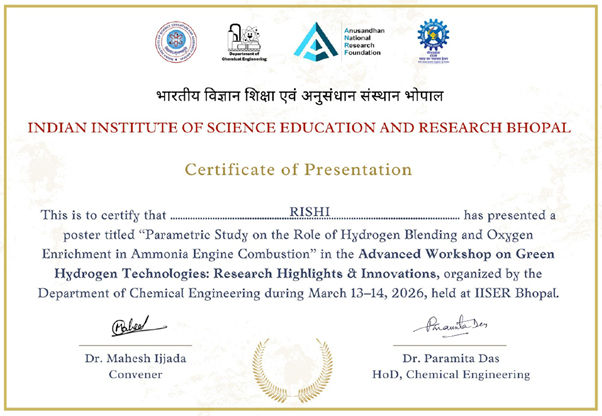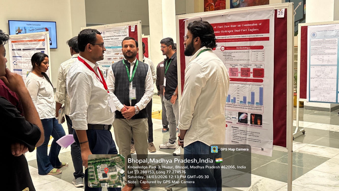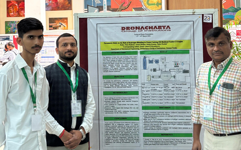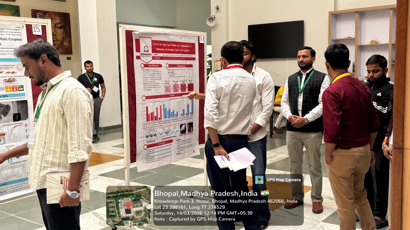 Mechanical Engineering students Mr. Rishi and Mr. Krishna Aggarwal from Dronacharya Group of Institutions, Greater Noidaparticipated in the Advanced Workshop on Green Hydrogen Technologiesunder the aegis of SAE India Collegiate club supervised by Faculty Co-Ordinators, Prof. (Dr.) Shailesh Kumar Singh and Dr. Saket Kumar: Research Highlights & Innovations organized by the Indian Institute of Science Education and Research Bhopal on 13 - 14 March 2026. Owing to the workshop’s relevance and focus on emerging energy solutions, it attracted more than 500 applicants, out of which the team was selected after a rigorous screening process to participate and present their research through poster presentations.