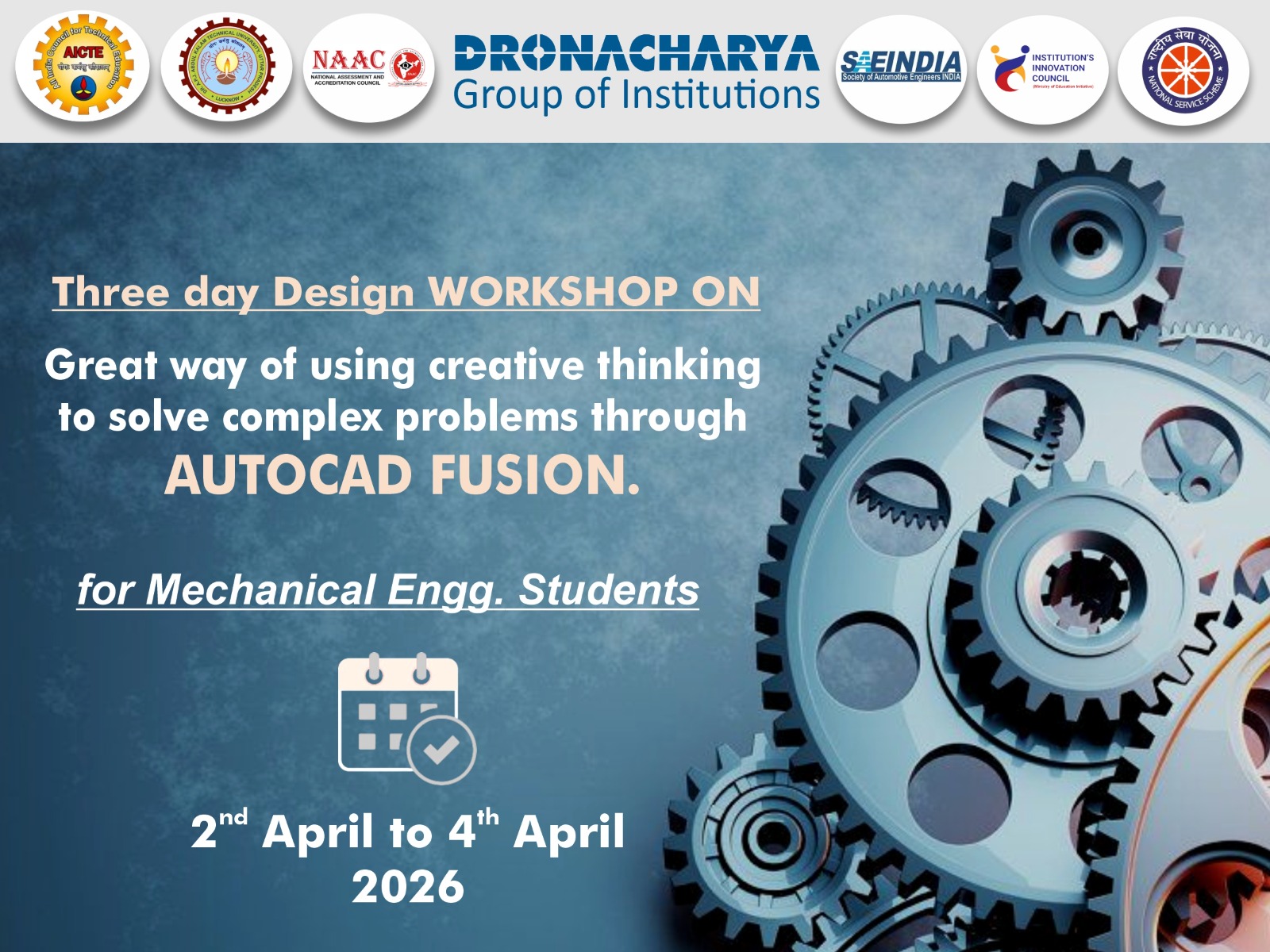 Department of Mechanical Engineering of Dronacharya Group of Institutions organized a comprehensive three-day workshop on Advanced Design Software, AutoCAD Fusion from 2nd April 2026 to 4th April 2026. This initiative was undertaken to enrich the learning experience of students and enhance their practical skills, effectively bridging the gap between theoretical knowledge and real-world industrial applications.