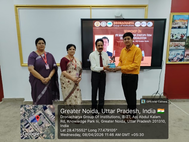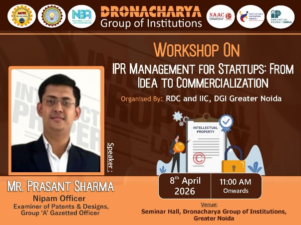 Institution’s Innovation Council (IIC) and Research and Development Cell (RDC)of Dronacharya Group of Institutions (DGI), Greater Noida organised a workshop on “Intellectual Property Rights (IPR) and IP Management for Startups - From Idea to Commercialization” on 08th April 2026. Workshop was coordinated by Prof.Pallavi Verma(Associate Professor, EEE) under the supervision of Prof. Sanghamitra V Arora(IIC Convenor & RDC Head). A total of 83 students along with 10 faculty members actively participated in the workshop.